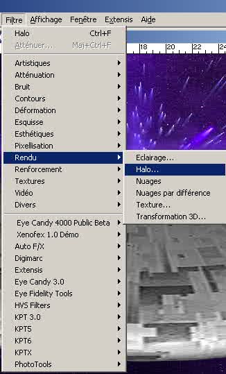 Dans le menu Filtre cliquez sur Rendu, puis Halo, Objectif 50-300mm et luminosité à 100%. Voir figure ci-dessous. |