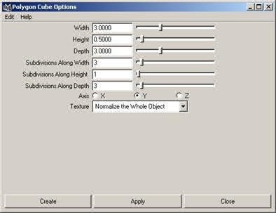 une fois le Polygon Cube Options ouvert, réglez les paramètres comme suit, à Width 3.0000, Height 0.5000, Depth 3.0000, Subdivisions Along Width 3, Subdivisions Along Height 1, Subdivisions Along Depth 3, Axis Y, Texture sur Normalize the Whole Object et cliquez sur Create puis Close, voir la figure ci-dessous. |
