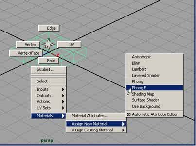 Zoomez un peu, (View > Camera Tool > Tract Tool). Etape 3 : Cliquez sur le pCube1 en appuyant sur le bouton droit de la souris, et faite glisser le désignateur du Marking menu, sur Materials > Assign New Material > Phong E, comme sur la figure ci-dessous. |