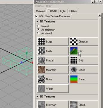 une fois le panneau « Create Render Node » ouvert, cliquez sur l'onglet Textures, cochez le bouton radio « As projection », puis cliquez sur le bouton File, comme sur la figure ci-dessous. |