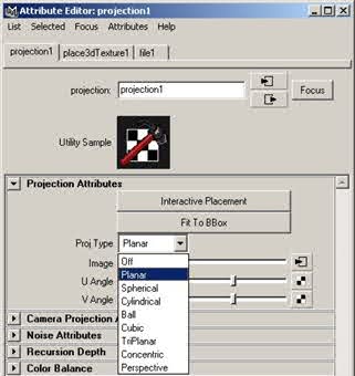 un nouveau panneau s'ouvre, l'Attribute editor : projection1, dans la section Projection Attributes, à Proj Type, cliquez sur le petit bouton en forme de flèche vers le bas, et dans le menu déroulant, choisissez la projection Planar, comme sur la figure ci-dessous. |