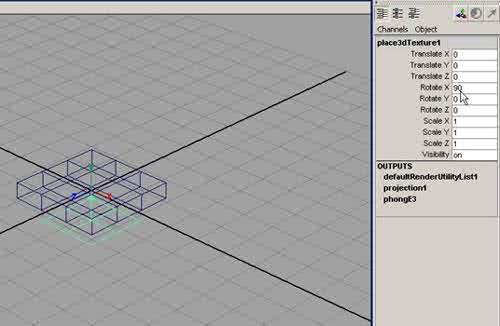 puis dans la boîte des canaux, dans la section Place3dTexture1, réglez les paramètres de Rotate X à 90 et validez, |