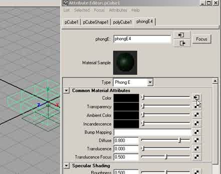 Etape 4 : Retournez dans la boîte des canaux, dans le menu Objet> pCube1, cliquez sur le petit bouton en forme de cube, pour ouvrir l'éditeur d'attributs et cliquez maintenant sur l'onglet phongE4, puis dans la section Common Material Attributes, à Color, cliquez sur le bouton où ce trouve le pointeur, |