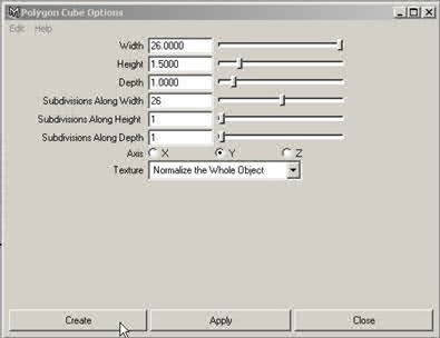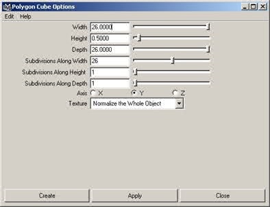 Etape 9 : Dans « Create > Polygon Primitives > Cube » de la barre de menu, cliquez sur l'icône en forme de cube, une fois le Polygon Cube Options ouvert, réglez les paramètres comme suit, à Width 26.0000, Height 0.5000, Depth 26.0000, Subdivisions Along Width 26, Subdivisions Along Height 1, Subdivisions Along Depth 1, Axis Y, Texture sur Normalize the Whole Object et cliquez sur Create puis Close, voir la figure ci-dessous, |