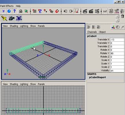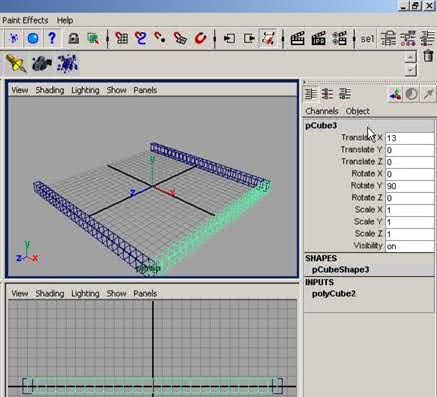 Etape 7 : Dans « Create > Polygon Primitives > Cube » de la barre de menu, cliquez sur l'icône en forme de cube, une fois le Polygon Cube Options ouvert, ne changez pas les paramètres mais cliquez sur Create puis Close. Dans la boîte des canaux, réglez les paramètres de pCube3 comme suit, Translate X 13, Rotate Y 90, et validez, voir la figure ci-dessous. |