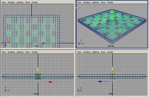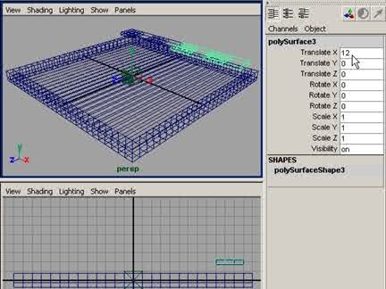 Etape 12 : Maintenant passez en 4 vues, puis réimporter les carreaux, dans File > Import, chargez le Carreau Noir, puis dans la boîte des canaux, réglez les paramètres de Carreau_noir_pCube1 comme suit, Translate X -10.5, Y 2 et Z -10.5, puis validez. Chargez le Carreau Blanc (File > Import), puis dans la boîte des canaux, réglez les paramètres de Carreau_Blanc_pCube2 comme suit, Translate X -7.5, Y 2 et Z -10.5, puis validez. Chargez encore un Carreau Noir (File > Import), puis dans la boîte des canaux, réglez les paramètres de Carreau_Noir_pCube2 comme suit, Translate X -4.5, Y 2 et Z -10.5, puis validez. Chargez encore un Carreau Blanc (File > Import), puis dans la boîte des canaux, réglez les paramètres de Carreau_Blanc_pCube3 comme suit, Translate X -1.5, Y 2 et Z -10.5, puis validez. Sélectionnez le Carreau_noir_pCube1, puis avec la touche Maj enfoncée, le Carreau_Blanc_pCube2, le Carreau_Noir_pCube2, le Carreau_Blanc_pCube3, puis dans la barre de menu, cliquez sur Polygon > Combine, ce qui vous donne le polySurface2. Dans la barre de menu, cliquez sur Edit > Duplicate with Transform et dans la boîte des canaux, réglez les paramètres de popySurface3 comme suit, Translate X 12 et validez, vous devriez avoir la figure ci-dessous. |
