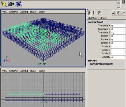 Etape 15 : Sélectionnez le polySurface6, puis avec la touche Maj enfoncée, le polySurface7, puis dans la barre de menu, cliquez sur Polygon > Combine, ce qui vous donne le polySurface8. Dans la barre de menu, cliquez sur Edit > Duplicate with Transform et dans la boîte des canaux, réglez les paramètres de popySurface9 comme suit, Translate Z 12 et validez, vous devriez avoir la figure ci-dessous. |