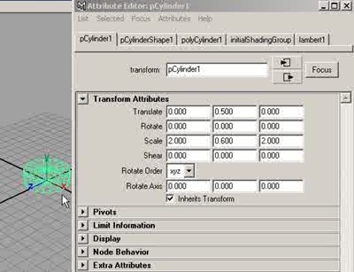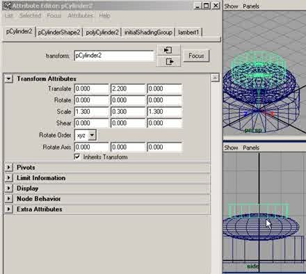 Etape 3 : Cliquez sur Create > Polygon Primitives > Cylinder ou si vous préférez, cliquez sur l'icône « Poly Cylinder ». Puis dans la boîte des canaux, dans le menu Objet> pCylinder2, cliquez sur le petit bouton en forme de cube, pour ouvrir l'éditeur d'attributs et dans la section Transform Attributes, réglez les paramètres comme suit, à Translate en (Y 2.200) et à Scale en (X 1.300), (Y 0.300), (Z 1.300), puis cliquez sur close, comme sur la figure ci-dessous. |