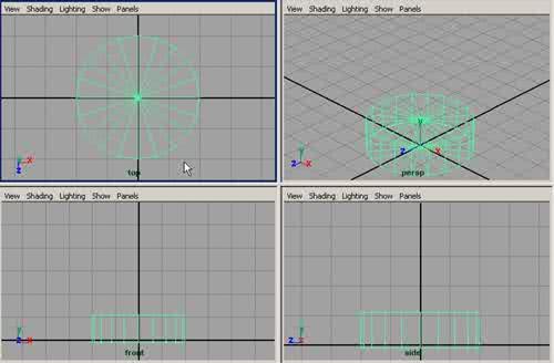 Cliquez sur l'icône des 4 vues, mais si vous préférez, la barre de menu : cliquez sur Window > View Arrangement > Four Panes, dans la barre de menu de la vue active, cliquez sur View > Camera Tools > Zoom Tool et zoomez pour agrandir la perspective jusqu'à ce que la sphère prenne presque toute la vue, cliquez sur View > Camera Tools > Track Tool, puis déplacez vers le bas les trois autres vues si besoin est, comme sur la figure ci-dessous. |