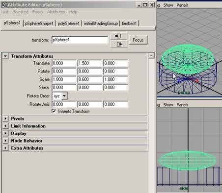 Etape 2 : Cliquez sur Create > Polygon Primitives > Sphere, puis dans la boîte des canaux, dans le menu Objet> pSphere1, cliquez sur le petit bouton en forme de cube, une fois l'éditeur d'attributs ouvert, dans la section Transform Attributes, réglez les paramètres comme suit, à Translate en (Y 1.500) et à Scale en (X 1.800), (Y 0.600), (Z 1.800), puis cliquez sur close, comme sur la figure ci-dessous. |