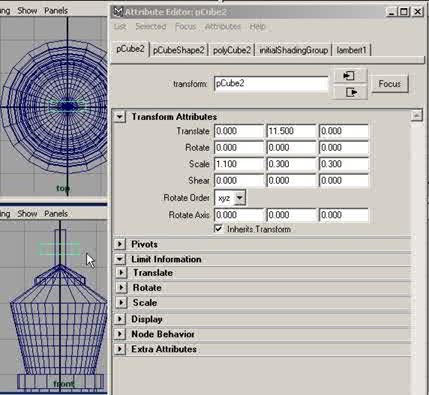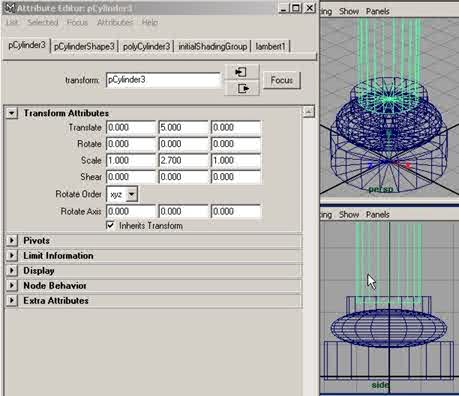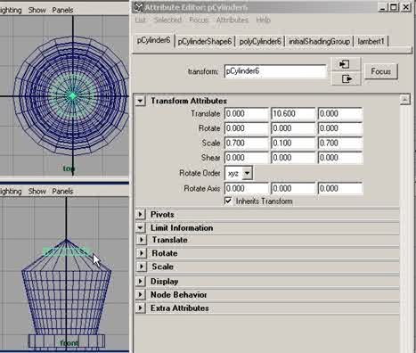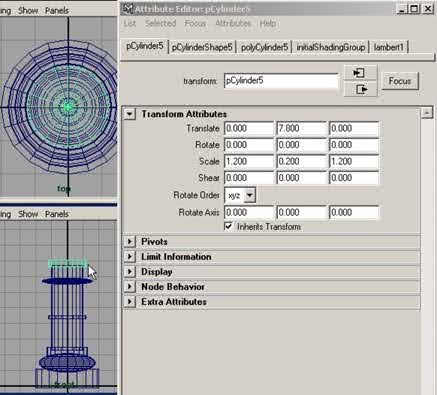 Etape 7 : Dans la barre de menu, cliquez sur Create > Polygon Primitives > Cylinder. Puis dans la boîte des canaux, dans le menu Objet> pCylinder5, cliquez sur le petit bouton en forme de cube, pour ouvrir l'éditeur d'attributs, dans la section Transform Attributes, réglez les paramètres comme suit, à Translate en (Y 7.800) et à Scale en (X 1.200), (Y 0.200), (Z 1.200), puis cliquez sur close, comme sur la figure ci-dessous. |