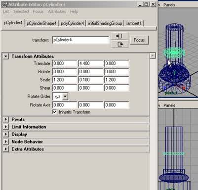 Etape 5 : Dans la barre de menu, cliquez sur Create > Polygon Primitives > Cylinder. Puis dans la boîte des canaux, dans le menu Objet> pCylinder4, cliquez sur le petit bouton en forme de cube, pour ouvrir l'éditeur d'attributs, dans la section Transform Attributes, réglez les paramètres comme suit, à Translate en (Y 4.400) et à Scale en (X 1.200), (Y 0.100), (Z 1.200), puis cliquez sur close, comme sur la figure ci-dessous. |