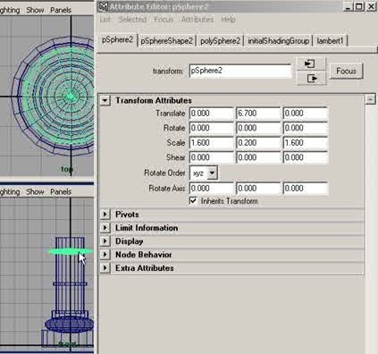 Etape 6 : Dans la barre de menu, cliquez sur Create > Polygon Primitives > Sphere, puis dans la boîte des canaux, dans le menu Objet> pSphere2, cliquez sur le petit bouton en forme de cube, une fois l'éditeur d'attributs ouvert, dans la section Transform Attributes, réglez les paramètres comme suit, à Translate en (Y 6.700) et à Scale en (X 1.600), (Y 0.200), (Z 1.600), puis cliquez sur close, comme sur la figure ci-dessous. |