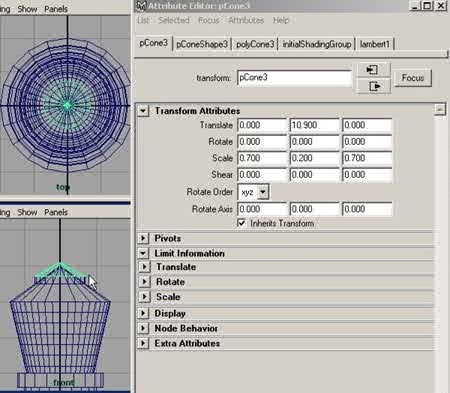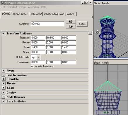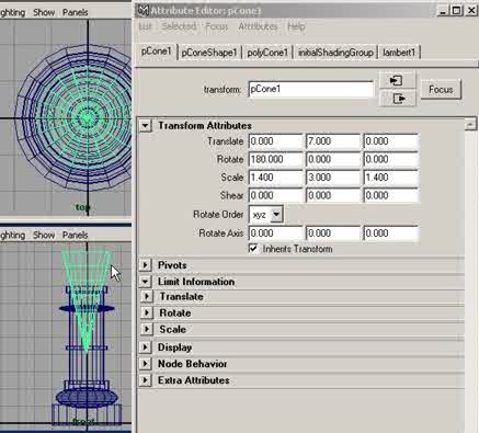 Etape 8 : Dans la barre de menu, cliquez encore une fois sur Create > Polygon Primitives > Cone, puis dans la boîte des canaux, dans le menu Objet> pCone1, cliquez sur le petit bouton en forme de cube, une fois l'éditeur d'attributs ouvert, dans la section Transform Attributes, réglez les paramètres comme suit, à Translate en (Y 7.000), à Rotate en (X 180.000) et à Scale en (X 1.400), (Y 3.000), (Z 1.400), comme sur la figure ci-dessous. |