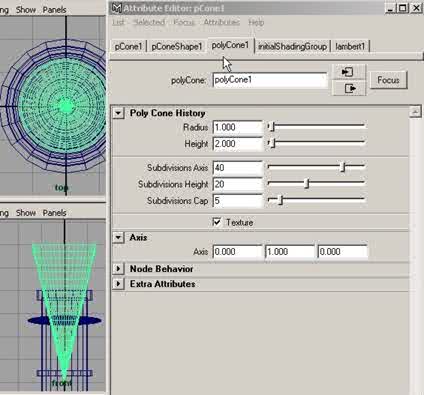Etape 9 : Puis cliquez sur l'onglet polyCone1, dans la section Poly Cone History, réglez les paramètres comme suit, à Radius 1.000, Height 2.000, Subdivisions Axis 40, Subdivisions Height 20 et à Subdivisions Cap 5, puis cliquez sur close, comme sur la figure ci-dessous. |