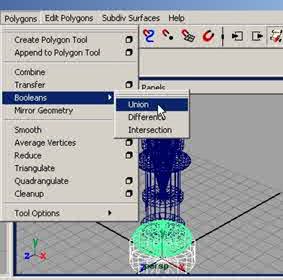 Etape 10 : Assemblez les polygones en un seul objet, sélectionnez le pCylinder1 puis avec la touche Maj enfoncée, le pSphere1, puis dans la barre de menu, cliquez sur Polygon > Booleans > Union, comme sur la figure ci-dessous. |