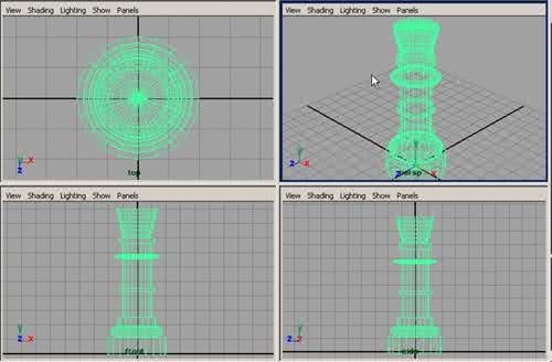 Etape 4 : Cliquez sur Create > Polygon Primitives > Cylinder ou si vous préférez, cliquez sur l'icône « Poly Cylinder ». Puis dans la boîte des canaux, dans le menu Objet> pCylinder3, cliquez sur le petit bouton en forme de cube, pour ouvrir l'éditeur d'attributs, dans la section Transform Attributes, réglez les paramètres comme suit, à Translate en (Y 5.000) et à Scale en (X 1.000), (Y 2.700), (Z 1.000), puis cliquez sur close. Dans la barre de menu de la vue active, cliquez sur View > Camera Tools > Track Tool et déplacez la caméra de manière à voir le haut du dernier cylindre, dans les trois vues si besoin est, puis recentrez si nécessaire, comme sur la figure ci-dessous. |