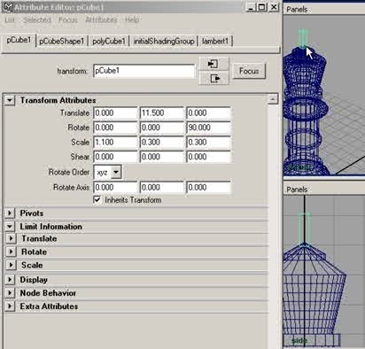Etape 14 : Dans la barre de menu, cliquez sur Create > Polygon Primitives > Cube, puis dans la boîte des canaux, dans le menu Objet> pCube1, cliquez sur le petit bouton en forme de cube, une fois l'éditeur d'attributs ouvert, dans la section Transform Attributes, réglez les paramètres comme suit, à Translate en (Y 11.500), Rotate en (Z 90.000) et à Scale en (X 1.100), (Y 0.300), (Z 0.300), comme sur la figure ci-dessous. |