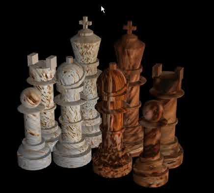 Etape 16 : Sélectionnez le polySurface7 puis avec la touche Maj enfoncée, le pCone2, puis dans la barre de menu, cliquez sur Polygon > Booleans > Union, ce qui vous donne le polySurface8. Sélectionnez le polySurface8 puis avec la touche Maj enfoncée, le pCylinder6, puis dans la barre de menu, cliquez sur Polygon > Booleans > Union, ce qui vous donne le polySurface9. Sélectionnez le polySurface9 puis avec la touche Maj enfoncée, le pCone3, puis dans la barre de menu, cliquez sur Polygon > Booleans > Union, ce qui vous donne le polySurface10. Sélectionnez le polySurface10 puis avec la touche Maj enfoncée, le pCube1, puis dans la barre de menu, cliquez sur Polygon > Booleans > Union, ce qui vous donne le polySurface11. Sélectionnez le polySurface11 puis avec la touche Maj enfoncée, le pCube2, puis dans la barre de menu, cliquez sur Polygon > Booleans > Union, ce qui vous donne le polySurface12. Puis dans la boîte des canaux, dans le menu Objet> polySurface12, cliquez sur le petit bouton en forme de cube, une fois l'éditeur d'attributs ouvert, cliquez sur l'onglet polySurface12, renommez-le « Roi_blanc. » et attribuez-lui la texture des blanc. Cliquez sur le Roi_blanc en appuyant sur le bouton droit de la souris, et faites glisser le désignateur du Marking menu, sur Materials > Assign New Material > Phong E, cliquez sur l'onglet PhongE1, et dans la section Common Material Attributes, à Color, cliquez sur le bouton en forme de damier, une fois le panneau « Create Render Node » ouvert, cliquez sur l'onglet Textures, cochez le bouton radio « As projection », puis cliquez sur le bouton File, un nouveau panneau s'ouvre, l'Attribute editor : projection1, cliquez sur le petit bouton en forme de flèche vers le bas, et dans le menu déroulant, choisissez la projection Spherical, ce qui va parfaitement entourer notre sphère, puis dans Projection Attributes, à Image, cliquez sur le bouton à droite de la glissière, ce qui ouvre le panneau « Attribute editor : file1 », cliquez sur le bouton dossier, pour lui indiquer le chemin et double-cliquez sur le nom de votre texture bitmap, cliquez sur select puis close. Exportez le Roi Blanc, dans votre bibliothèque d'objets, dans la barre de menu, cliquez sur File > Export Selection. Une fois la Roi Blanc exporté, revenez dans la boîte des canaux, et dans le menu Objet> Roi_Blanc, cliquez sur le petit bouton en forme de cube, une fois l'éditeur d'attributs ouvert, cliquez sur l'onglet Roi_Blanc, renommez-le « Roi_Noir. ». Changez la texture. Cliquez sur le Roi_Noir en appuyant sur le bouton droit de la souris, et faites glisser le désignateur du Marking menu, sur Materials > Assign New Material > Phong E, cliquez sur l'onglet PhongE2, et dans la section Common Material Attributes, à Color, cliquez sur le bouton en forme de damier, une fois le panneau « Create Render Node » ouvert, cliquez sur l'onglet Textures, cochez le bouton radio « As projection », puis cliquez sur le bouton File, un nouveau panneau s'ouvre, l'Attribute editor : projection1, cliquez sur le petit bouton en forme de flèche vers le bas, et dans le menu déroulant, laissez la projection Spherical, puis dans Projection Attributes, à Image, cliquez sur le bouton à droite de la glissière, ce qui ouvre le panneau « Attribute editor : file1 », cliquez sur le bouton dossier, pour lui indiquer le chemin et double-cliquez sur le nom de la texture des Noir, cliquez sur select puis close. Puis exportez le Roi Noir, dans votre bibliothèque d'objets, (cliquez sur File > Export Selection), vous devez avoir 8 objets maintenant, le pion blanc, le pion noir, le fou blanc, le fou noir, la tour blanche, la tour noir, le roi blanc et le roi noir. Etape 17 : Chargez le projet Echecs avec les 6 Pièces et importez le Roi Blanc et le Roi Noir de votre bibliothèque d'objets. déplacez la caméra de manière à voir les 8 pièces, dans les trois vues si besoin est et recentrez si nécessaire. Et faites un rendu, cliquez sur le module de Rendering, et cliquez sur Render > Render Current Frame. Admirez votre oeuvre, vous devriez avoir à peu près la figure ci-dessous. |