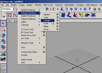 Etape 1 : Cliquez sur le module de modélisation, comme sur la figure ci-dessous, si ce n'est déjà fait. Cliquez sur l'icône « Poly Cylinder » ou si vous préférez, dans la barre de menu : cliquez sur Create > Polygon Primitives > Cylinder, comme sur la figure ci-dessous. |