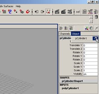 Puis dans la boîte des canaux, dans le menu Objet> pCylinder1, cliquez sur le petit bouton en forme de cube, à l'endroit du pointeur pour ouvrir l'éditeur d'attributs, comme sur la figure ci-dessous. |