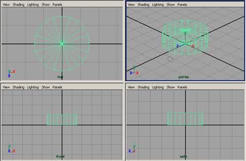Etape 4 : Dans la barre de menu, cliquez sur Create > Polygon Primitives > Cylinder ou si vous préférez, cliquez sur l'icône « Poly Cylinder ». Puis dans la boîte des canaux, dans le menu Objet> pCylinder3, cliquez sur le petit bouton en forme de cube, pour ouvrir l'éditeur d'attributs, dans la section Transform Attributes, réglez les paramètres comme suit, à Translate en (Y 4.500) et à Scale en (X 0.900), (Y 2.600), (Z 0.900), puis cliquez sur close. Dans la barre de menu de la vue active, cliquez sur View > Camera Tools > Track Tool et déplacez la caméra de manière à voir le haut du dernier cylindre, dans les trois vues si besoin est, puis recentrez si nécessaire, comme sur la figure ci-dessous. |