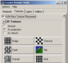Une fois le panneau « Create Render Node » ouvert, cliquez sur l'onglet Textures, cochez le bouton radio « As projection », puis cliquez sur le bouton File, comme sur la figure ci-dessous. |
