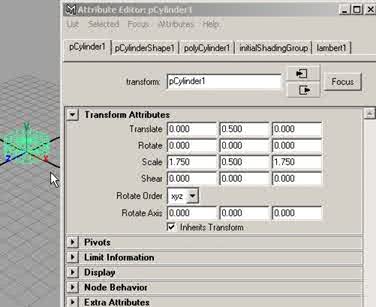 Cliquez sur l'onglet pCylinder1 et dans la section Transform Attributes, réglez les paramètres comme suit, à Translate en (Y 0.500) et à Scale en (X 1.750), (Y 0.500), (Z 1.750), puis cliquez sur close, comme sur la figure ci-dessous. |