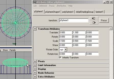 Puis dans la boîte des canaux, dans le menu Objet> pSphere1, cliquez sur le petit bouton en forme de cube, une fois l'éditeur d'attributs ouvert, dans la section Transform Attributes, réglez les paramètres comme suit, à Translate en (Y 1.300) et à Scale en (X 1.500), (Y 0.500), (Z 1.500), puis cliquez sur close, comme sur la figure ci-dessous. |
