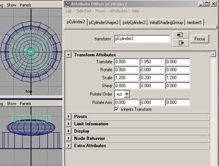 Etape 3 : Dans la barre de menu, cliquez sur Create > Polygon Primitives > Cylinder ou si vous préférez, cliquez sur l'icône « Poly Cylinder ». Puis dans la boîte des canaux, dans le menu Objet> pCylinder2, cliquez sur le petit bouton en forme de cube, pour ouvrir l'éditeur d'attributs et dans la section Transform Attributes, réglez les paramètres comme suit, à Translate en (Y 1.850) et à Scale en (X 1.200), (Y 0.200), (Z 1.200), puis cliquez sur close, comme sur la figure ci-dessous. |