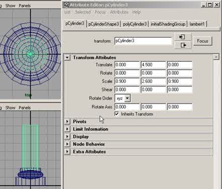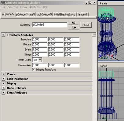 Etape 7 : Dans la barre de menu, cliquez sur Create > Polygon Primitives > Cylinder. Puis dans la boîte des canaux, dans le menu Objet> pCylinder5, cliquez sur le petit bouton en forme de cube, pour ouvrir l'éditeur d'attributs, dans la section Transform Attributes, réglez les paramètres comme suit, à Translate en (Y 7.500) et à Scale en (X 1.200), (Y 0.500), (Z 1.200), puis cliquez sur close, comme sur la figure ci-dessous. |