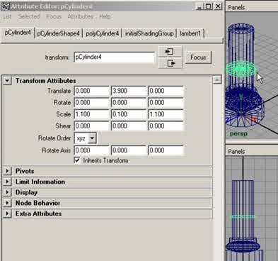 Etape 5 : Dans la barre de menu, cliquez sur Create > Polygon Primitives > Cylinder. Puis dans la boîte des canaux, dans le menu Objet> pCylinder4, cliquez sur le petit bouton en forme de cube, pour ouvrir l'éditeur d'attributs, dans la section Transform Attributes, réglez les paramètres comme suit, à Translate en (Y 5.000) et à Scale en (X 1.100), (Y 0.100), (Z 1.100), puis cliquez sur close, comme sur la figure ci-dessous. |