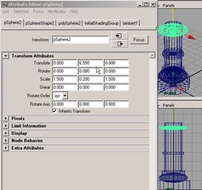 Etape 6 : Dans la barre de menu, cliquez sur Create > Polygon Primitives > Sphere, puis dans la boîte des canaux, dans le menu Objet> pSphere2, cliquez sur le petit bouton en forme de cube, une fois l'éditeur d'attributs ouvert, dans la section Transform Attributes, réglez les paramètres comme suit, à Translate en (Y 6.550) et à Scale en (X 1.500), (Y 0.200), (Z 1.500), puis cliquez sur close, comme sur la figure ci-dessous. |