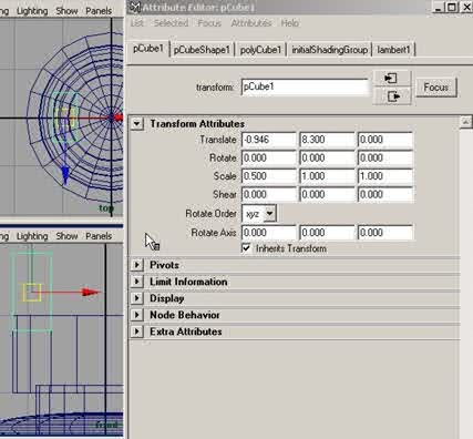 Etape 8 : Dans la barre de menu, cliquez encore une fois sur Create > Polygon Primitives > Cube, puis dans la boîte des canaux, dans le menu Objet> pCube1, cliquez sur le petit bouton en forme de cube, une fois l'éditeur d'attributs ouvert, dans la section Transform Attributes, réglez les paramètres comme suit, à Translate en (X –0.946), (Y 8.300) et à Scale en (X 0.500), (Y 1.000), (Z 1.000), puis cliquez sur close, comme sur la figure ci-dessous. |