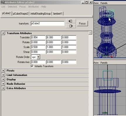 Etape 10 : Puis dans la boîte des canaux, dans le menu Objet> pCube2, cliquez sur le petit bouton en forme de cube, pour ouvrir l'éditeur d'attributs, dans la section Transform Attributes, réglez les paramètres comme suit, à Translate en (X 0.954), (Y 8.300) et à Scale en (X 0.500), (Y 1.000), (Z 1.000), puis cliquez sur close, comme sur la figure ci-dessous. |