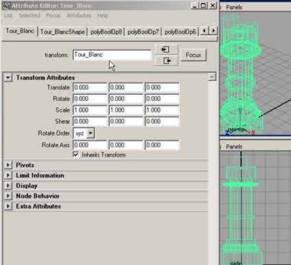Sélectionnez le polySurface1 puis avec la touche Maj enfoncée, le pCylinder2, puis dans la barre de menu, cliquez sur Polygon > Booleans > Union, ce qui vous donne le polySurface2. Sélectionnez le polySurface2 puis avec la touche Maj enfoncée, le pCylinder3, puis dans la barre de menu, cliquez sur Polygon > Booleans > Union, ce qui vous donne le polySurface3. Sélectionnez le polySurface3 puis avec la touche Maj enfoncée, le pCylinder4, puis dans la barre de menu, cliquez sur Polygon > Booleans > Union, ce qui vous donne le polySurface4. Sélectionnez le polySurface4 puis avec la touche Maj enfoncée, le pSphere2, puis dans la barre de menu, cliquez sur Polygon > Booleans > Union, ce qui vous donne le polySurface5. Sélectionnez le polySurface5 puis avec la touche Maj enfoncée, le pCylinder5, puis dans la barre de menu, cliquez sur Polygon > Booleans > Union, ce qui vous donne le polySurface6. Sélectionnez le polySurface6 puis avec la touche Maj enfoncée, le pCube1, puis dans la barre de menu, cliquez sur Polygon > Booleans > Union, ce qui vous donne le polySurface7. Sélectionnez le polySurface7 puis avec la touche Maj enfoncée, le pCube2, puis dans la barre de menu, cliquez sur Polygon > Booleans > Union, ce qui vous donne le polySurface8. Puis dans la boîte des canaux, dans le menu Objet> polySurface8, cliquez sur le petit bouton en forme de cube, une fois l'éditeur d'attributs ouvert, cliquez sur l'onglet polySurface8 et renommez-le « Tour_blanc. » Voir figure ci-dessous. |