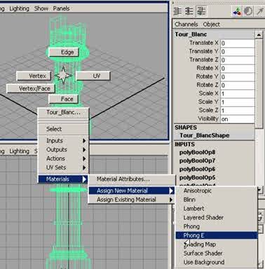Attribuez-lui également la texture du pion blanc. Cliquez sur le Fou_Blanc en appuyant sur le bouton droit de la souris, et faites glisser le désignateur du Marking menu, sur Materials > Assign New Material > Phong E, comme sur la figure ci-dessous. |