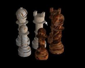 Etape 14 : Chargez le projet Echecs avec les 4 Pions, importer la Tour Blanche et la Tour Noir de votre bibliothèque d'objets. déplacez la caméra de manière à voir les 6 pièces, dans les trois vues si besoin est et recentrez si nécessaire. Et faites un rendu, cliquez sur le module de Rendering, et cliquez sur Render > Render Current Frame. Admirez votre oeuvre, vous devriez avoir à peu près la figure ci-dessous. |
