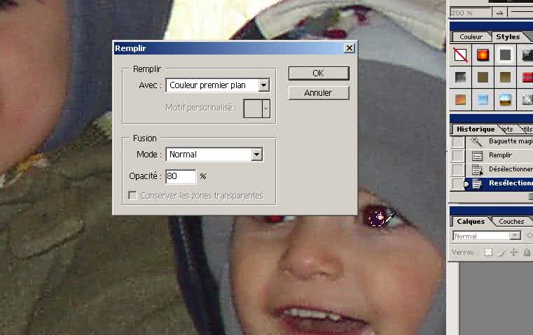 Dans le menu Edition cliquez sur Remplir, affichez Couleur premier plan et Opacité à 80% puis cliquez sur Ok, comme sur la figure ci-dessous. |